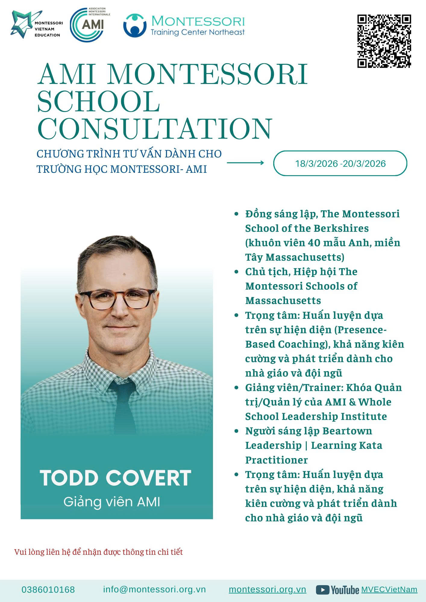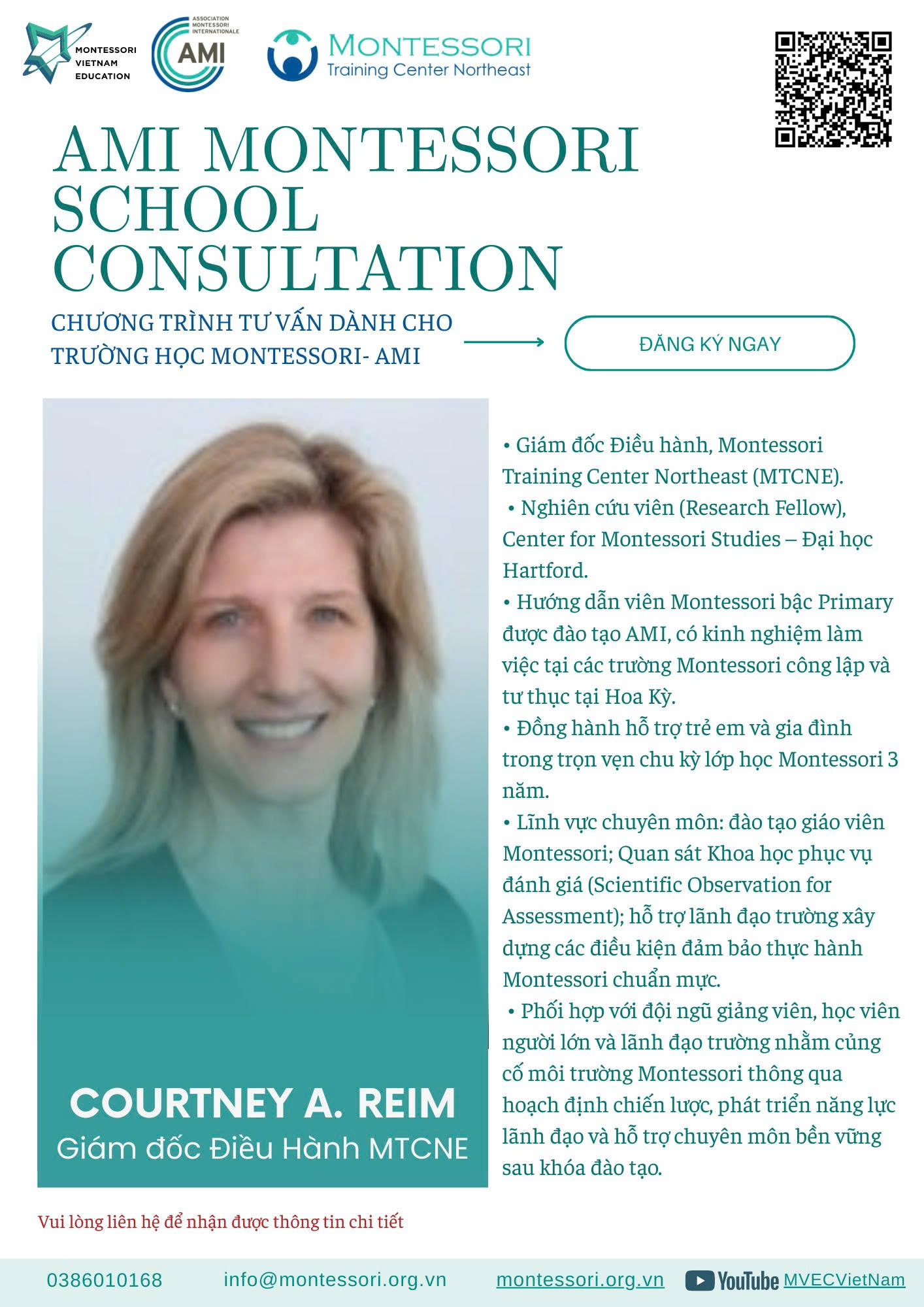 Chương trình Tư vấn vận hành trường học cũng như nghiên cứu và phát triển học liệu phù hợp với bối cảnh giáo dục Việt Nam. Mỗi chuyên gia không chỉ mang đến nền tảng chuyên môn chuẩn mực theo tinh thần Montessori quốc tế, mà còn thấu hiểu sâu sắc đặc điểm văn hóa, hệ thống giáo dục và nhu cầu thực tiễn của các trường học cũng như gia đình Việt Nam.