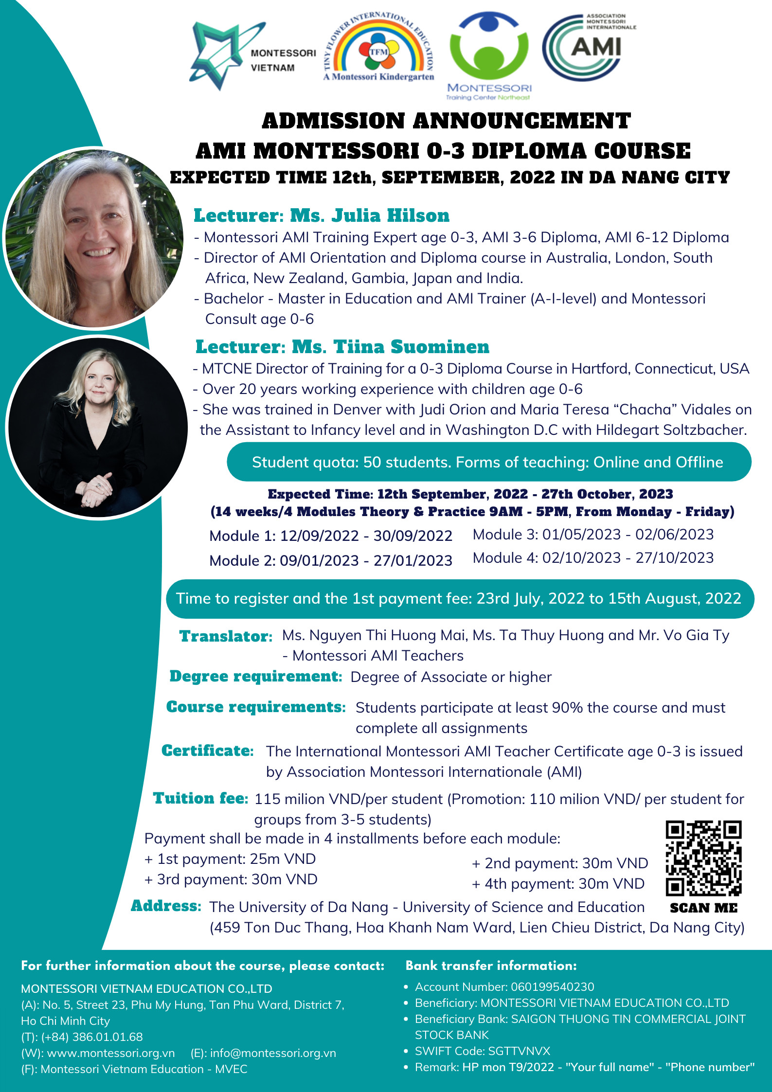 Công Ty Montessori Việt Nam Education (MVEC), Tiny Flower Montessori (TFM) và Trung tâm Đào tạo Đông Bắc Hoa Kỳ (MTCNE), Hiệp hội Montessori Quốc tế AMI phối hợp tổ chức Khóa Đào tạo Giáo viên Montessori AMI độ tuổi...
